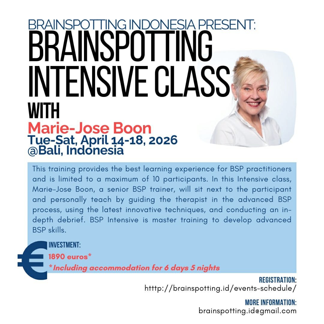 Brainspotting Intensive Class | In-person @Bali | Tuesday-Saturday, April 14-18, 2026 | Marie-Jose Boon | English |