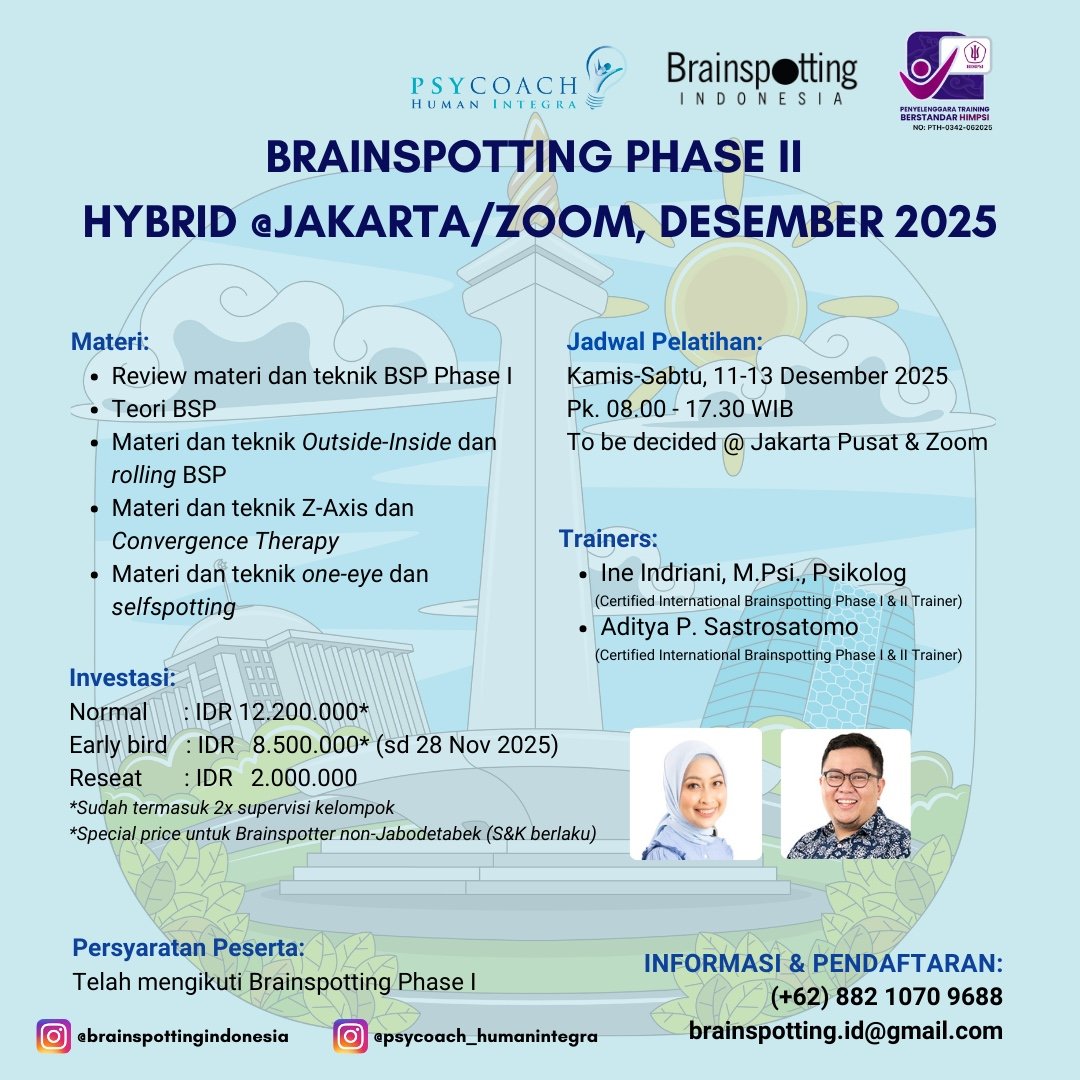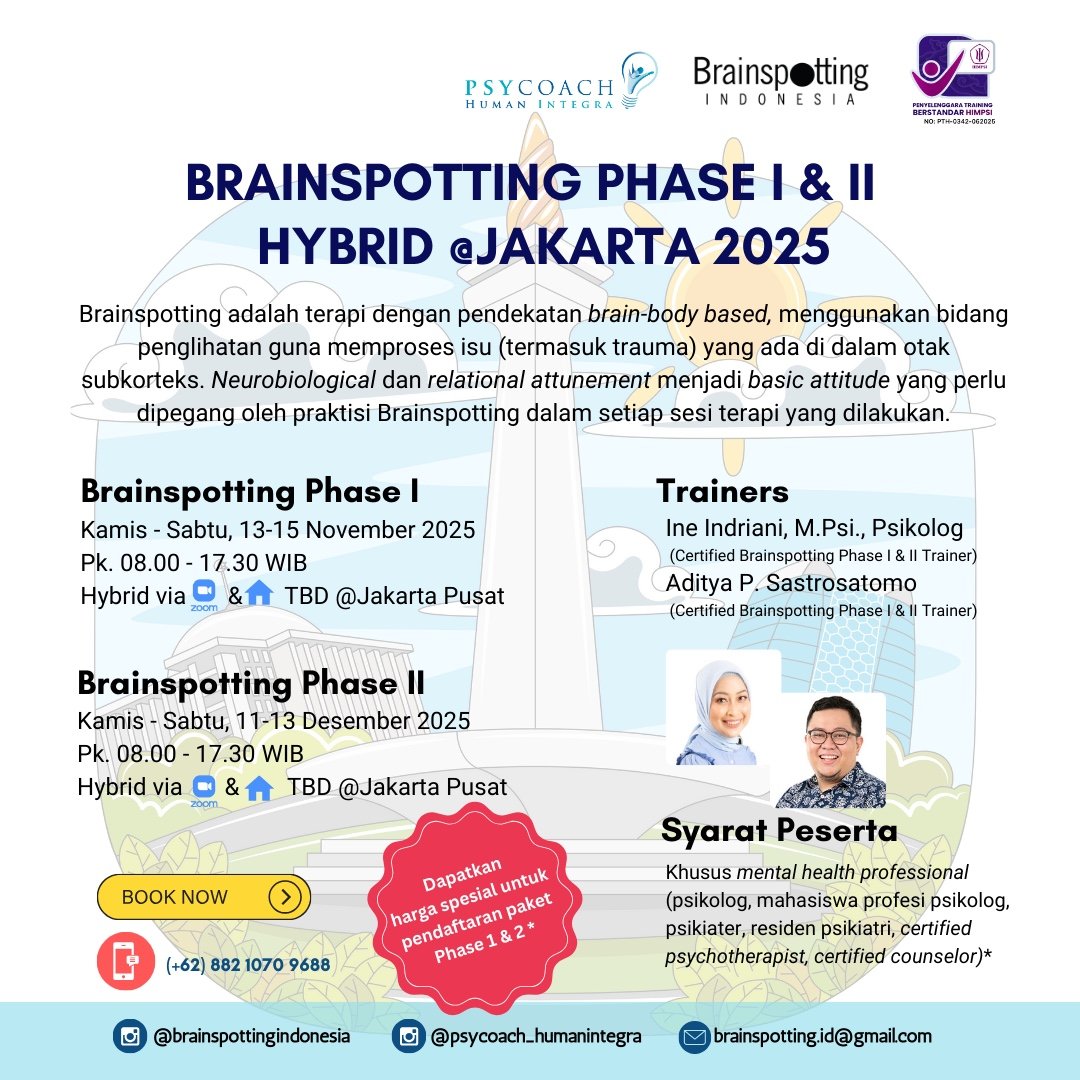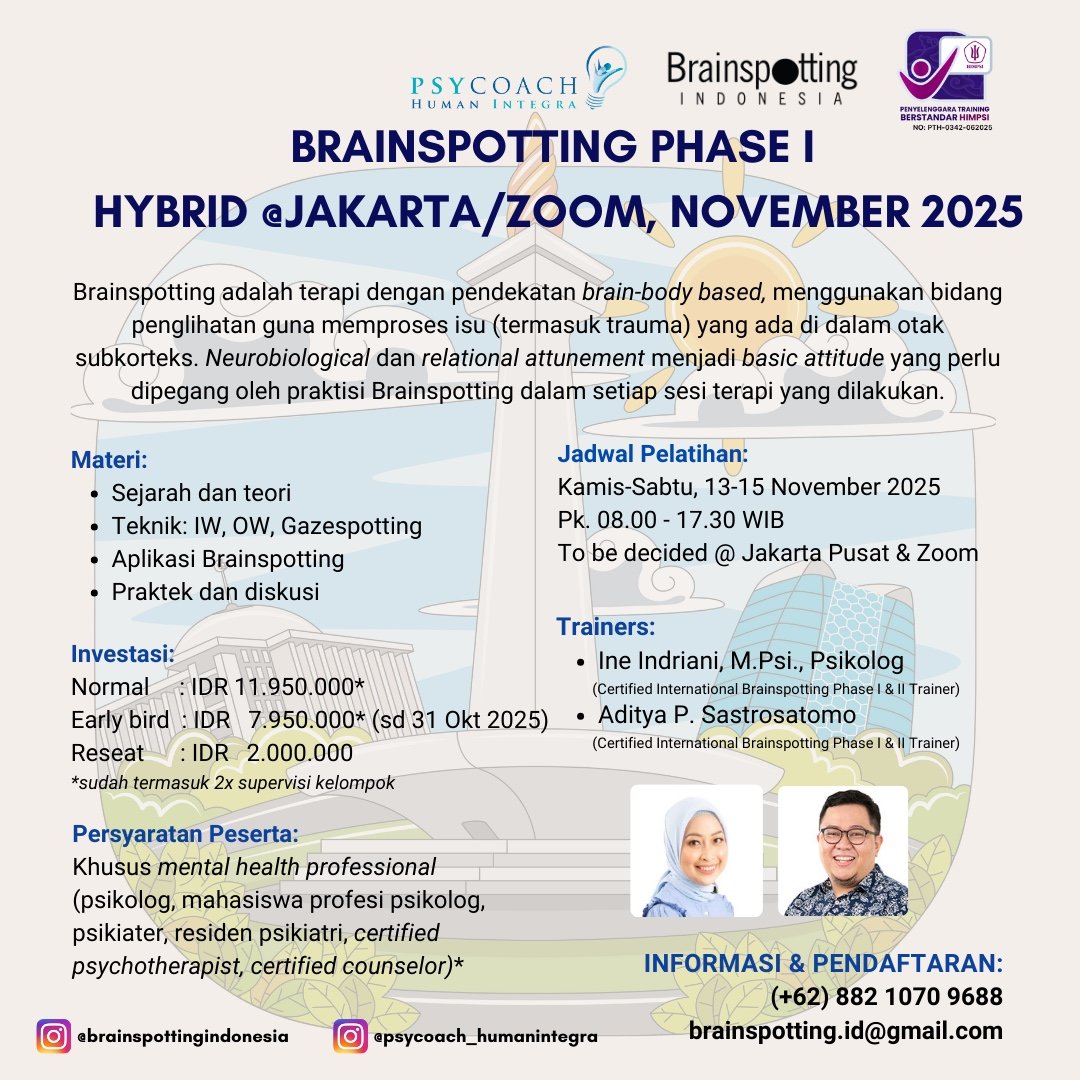 Brainspotting Phase 1 & Phase 2 (2 Phase Training Package) | Online & In-person @Jakarta | Phase 1: Thursday-Saturday, November 13-15, 2025 Phase 2: Thursday-Saturday, Desember 11-13, 2025 | Ine Indriani, M. Psi, Psikolog | Bahasa | ||